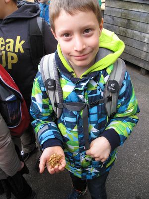 Frau Rösch zeigte uns einen ganzen Anhänger voll Apfelreste, diese nennt man Trester. Jeder von uns bekam etwas auf die Hand, um zu sehen welche Apfelteile übrig bleiben. Essen sollten wir sie nicht, denn die Apfelreste werden gerne von Kühen und Schweinen, Wildschweinen, Rehen und Hirschen gefressen. Es wird also der ganze Apfel verwertet und nichts weggeworfen.